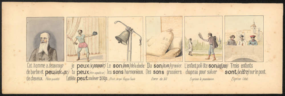 Représentations : barbe, athlète, cloche, son, politesse, pont / Les vignettes illustrent dans l'ordre suivant : cet homme a beaucoup de barbe et peu de cheveux ; je peux ; le son de la cloche ; du son grossier ; l'enfant poli ôte son chapeau pour saluer ; trois enfants sont sur le pont.