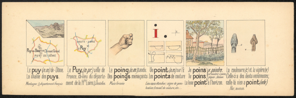 Représentations : Puy-de-Dôme, Le Puy-en-Velay, poing, couleuvre, vipère / Les vignettes illustrent dans l'ordre suivant : le puy-de-Dôme ; Le Puy, ville de France ; le poing tendu ; un point sur l'i ; je poins ; celle-ci a des dents venimeuses, celle-là n'en a point.