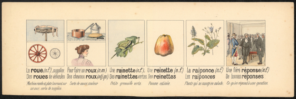 Planche illustrée pour apprendre l'homonymie : roue / roux, rainette / reinette, raiponce / réponse