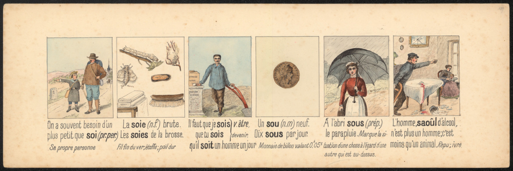 Représentations : ver à soie, parapluie, ivresse / Les vignettes illustrent dans l'ordre suivant : on a souvent besoin d'un plus petit que soi ; la soie brute ; il faut que je sois ; un sou neuf ; à l'abri sous le parapluie ; l'homme, saoûl d'alcool.