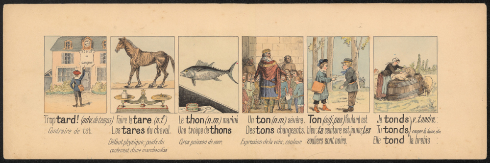 Planche illustrée pour apprendre l'homonymie : tard / tare, thon / ton / tonds