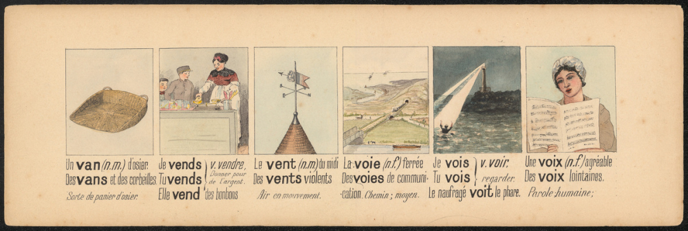 Planche illustrée pour apprendre l'homonymie : van / vends / vent, voie / vois / voix