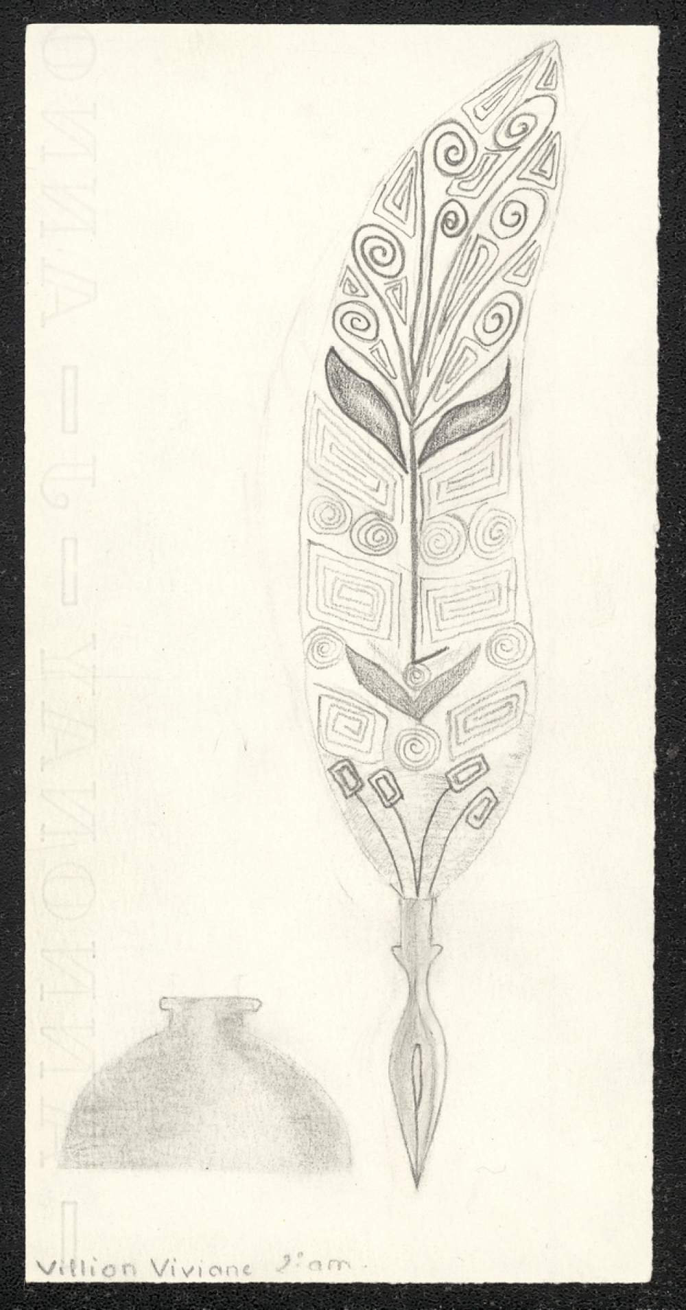 Représentations : plume / Représentation d'une plume au bout d'un porte-plume, et d'un encrier. Les motifs de la plume ont principalement une forme spiroïdale. L'encrier est entièrement colorié au crayon à papier, ainsi que le porte-plume et le bas de la plume.