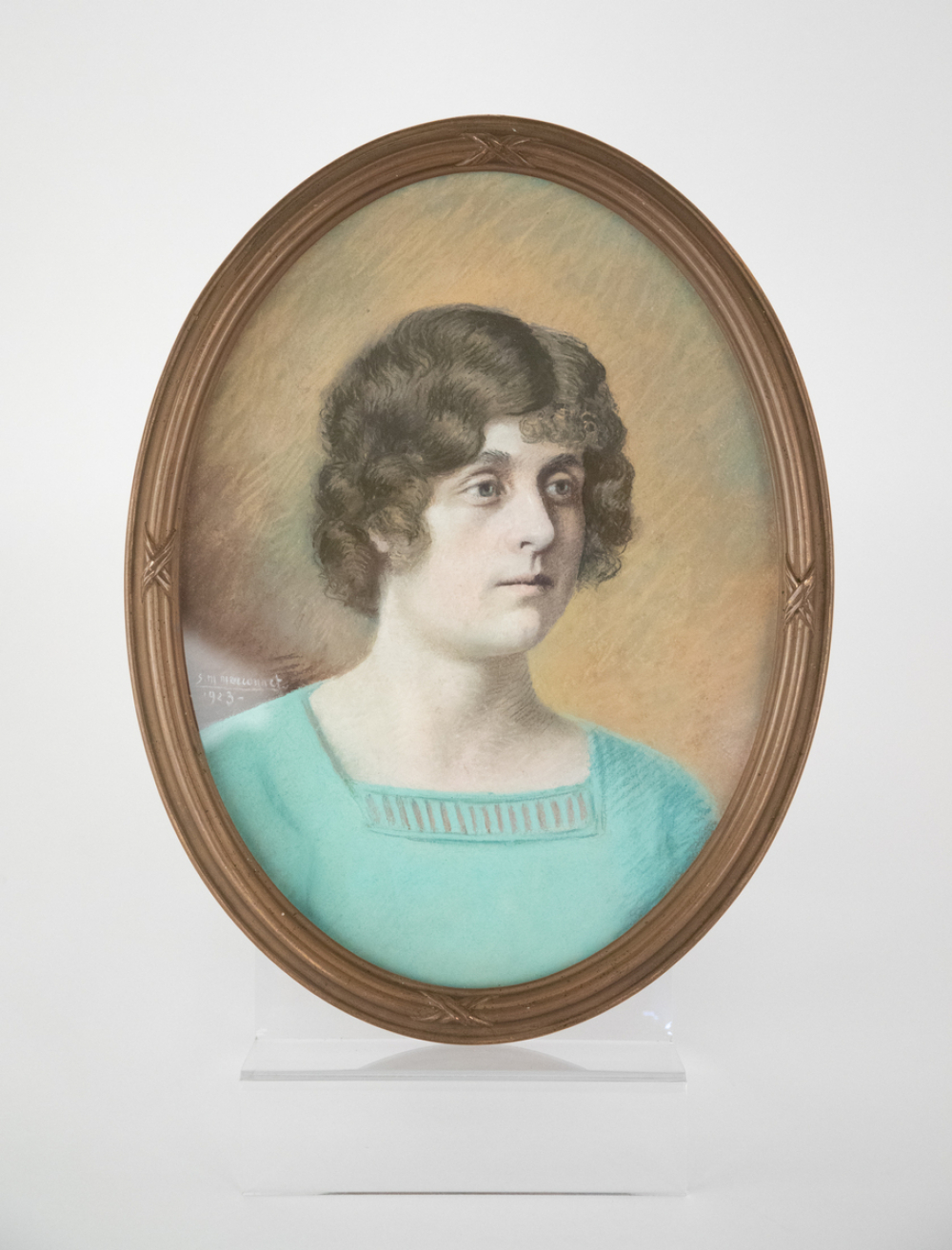 Description : Portrait de forme ovale représentant une femme de trois-quart.