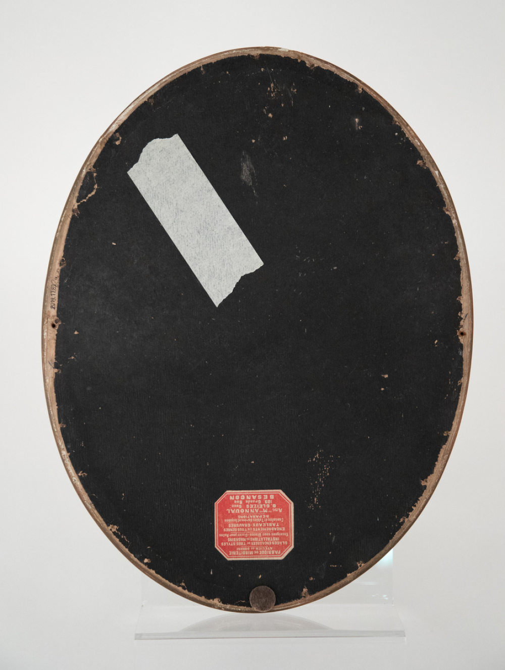 • étiquette : Fabrique de miroiterie atelier de dorure - glaces encadrées de tous styles - installations de magasins - Enseignes sou glaces. Glaces pour autos - encadrements en tous genre - Tableaux - Gravures - Consoles et tables dorées et laquées - réparations - Ancnne Mon Annoual O. Gleizes Succ. - 109. Grande Rue Besançon(sur dos)