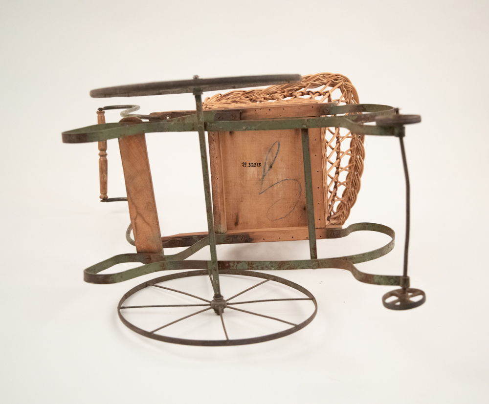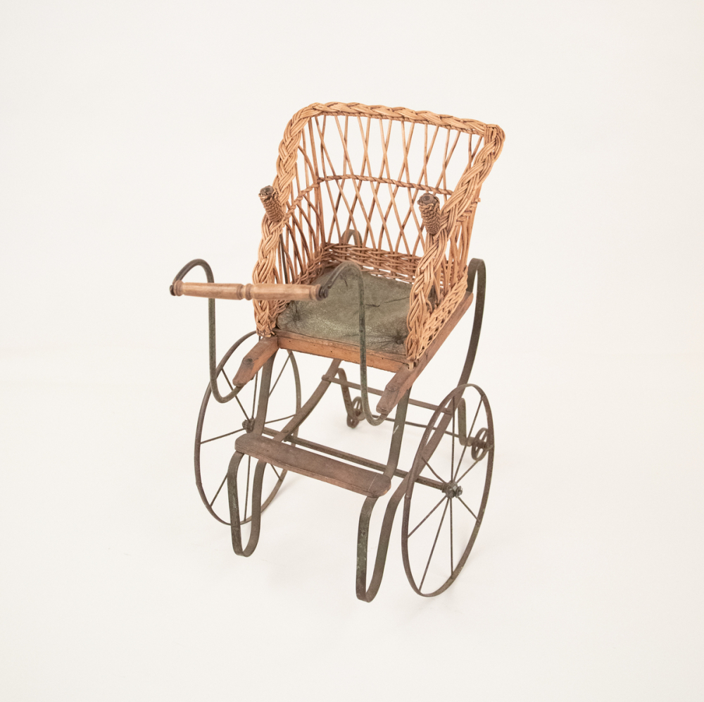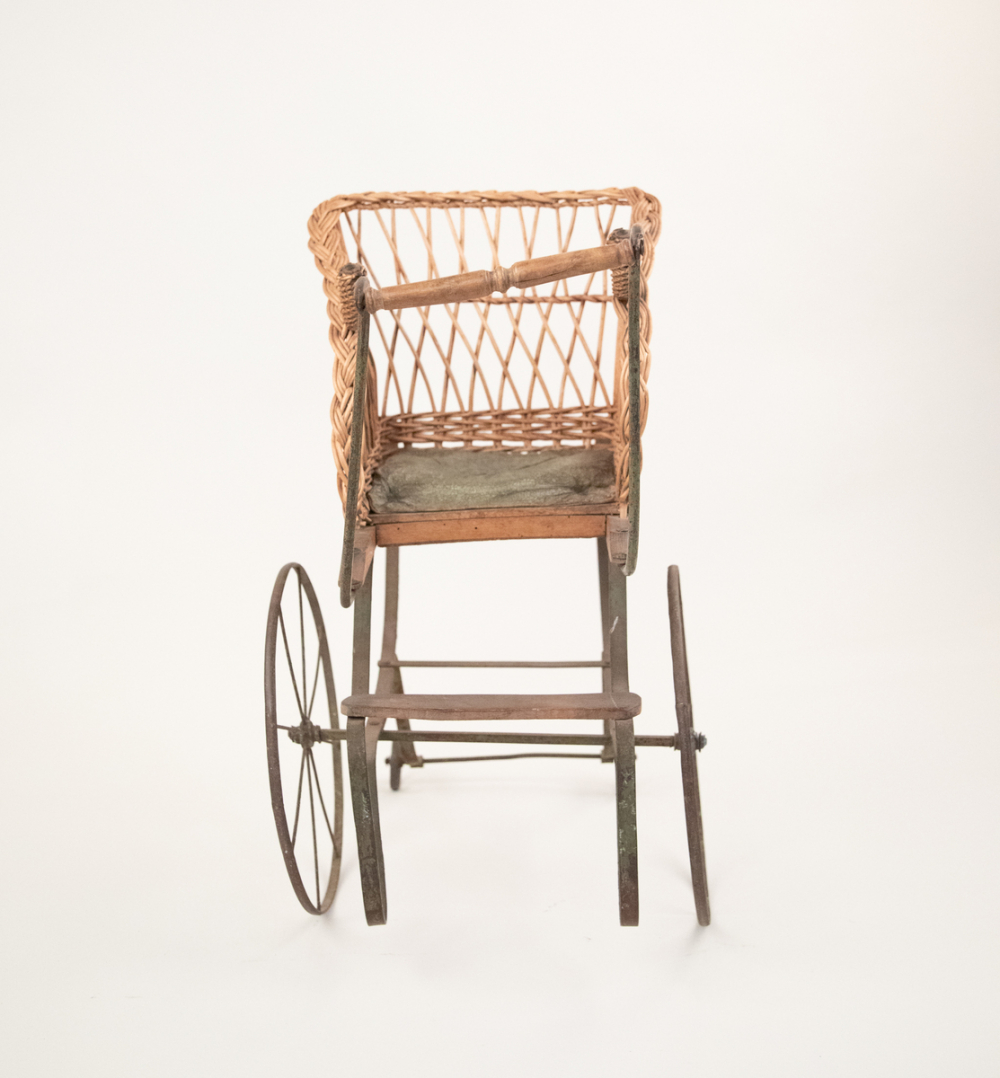 Description : poussette en bois et osier, armature métallique de couleur verte, siège en cuir vert, deux grandes roues à l'avant et deux petites à l'arrière, deux poignées de maintien en osier