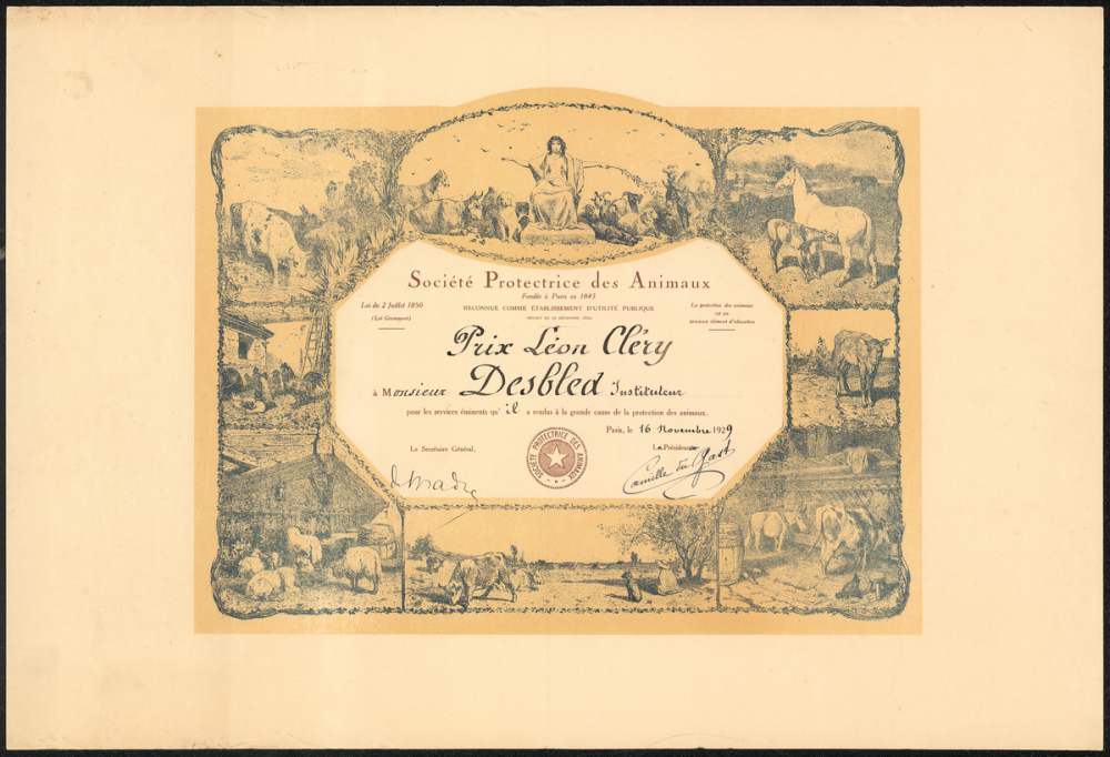Utilisation / destination : récompense (Diplôme décerné à Marcel Desbled, le 16 novembre 1929, "pour les services éminents qu'il a rendu à la grande cause de la protection des animaux".)