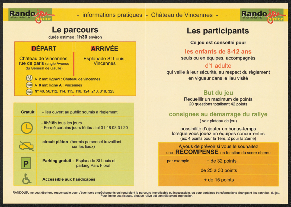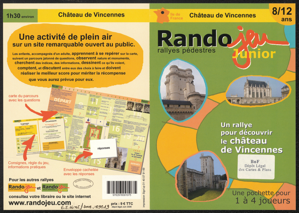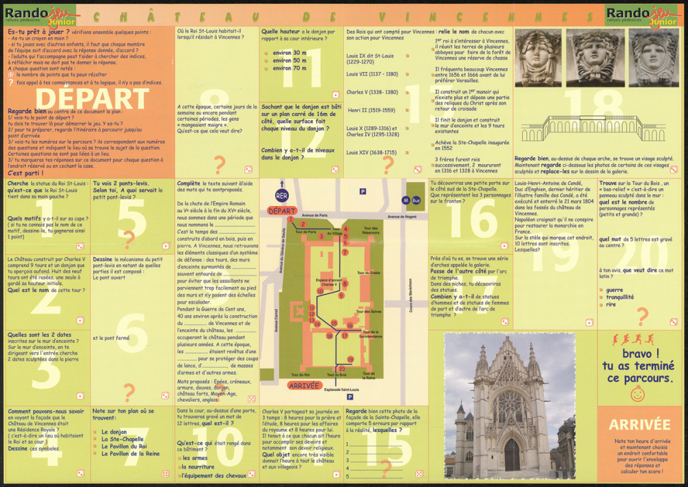 - une notice, dont la page de couverture est illustrée de vues du château de Vincennes à Paris. A l'intérieur, des consignes pour réaliser l'activité (notamment l'âge des enfants : de 8 à 12 ans), la taille et durée du parcours, le matériel nécessaire...