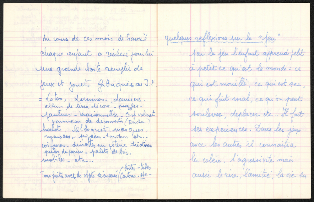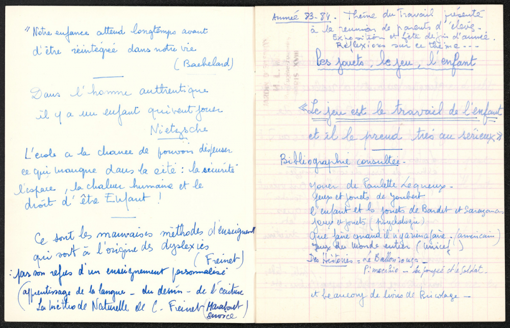 Notes : Il s'agit d'un cahier de prise de notes de lectures d'une enseignante du Jardin d'enfants H.L.M., situé au 02, rue Fournière (désormais au n° 20) à Paris dans le XVIIIe arrondissement, dépendant donc de l'accompagnement municipal des OPHLM de l'EJE (éducateur de jeunes enfants) de La Ville de Paris.
