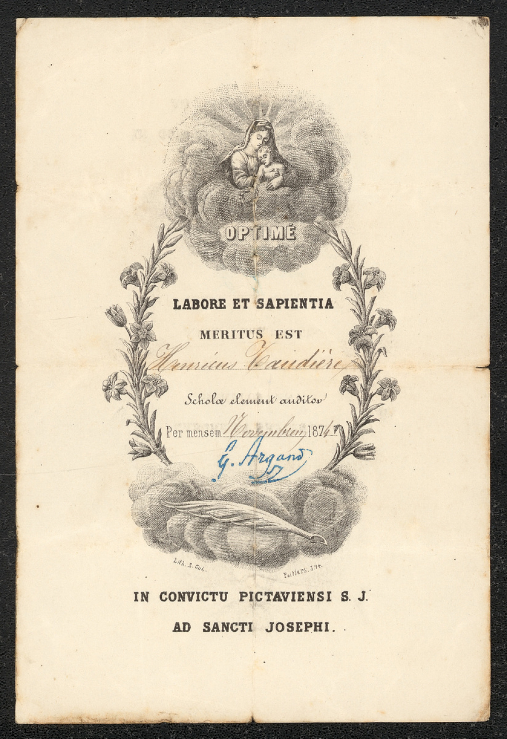 ill. : En haut, entouré d'une couronne nébuleuse, buste de la Vierge à l'enfant auréolés d'un soleil, lequel tient dans une main une couronne de lauriers. Au centre , dans un cadre de deux branches fleuries : "Optime. Labore et sapienta. Meritus est Henricus Taudière. Scholae element auditor. Per mensem novembris 1874". En bas, un nuage sur lequel repose une plume d'écriture surmontant l'inscription "In convictus pictaviensi S.J. AD sancti Josephi".