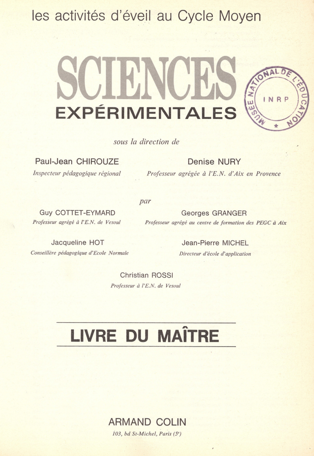 Notes : Coll. Les activités d'éveil au cycle moyen / ouvrage sous dir Chirouze (Paul-Jean) IPR et Nury (Denise) Pr. agrégée EN Aix en Provence / Granger (Georges) Pr. agrégé centre formation des PEGC à Aix, Hot (Jacqueline) conseillère pédagogique EN, Michel (Jean-Pierre) directeur école application, Rossi (Christian) Pr. EN Vesoul