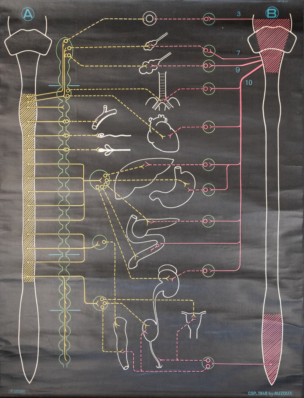 Description : Grande planche murale de sciences naturelles illustrée en couleurs sur fond noir, imprimée sur papier glacé épais avec baguettes en bois en haut et en bas de la planche munie d'un ruban de suspension et entoilée au dos.