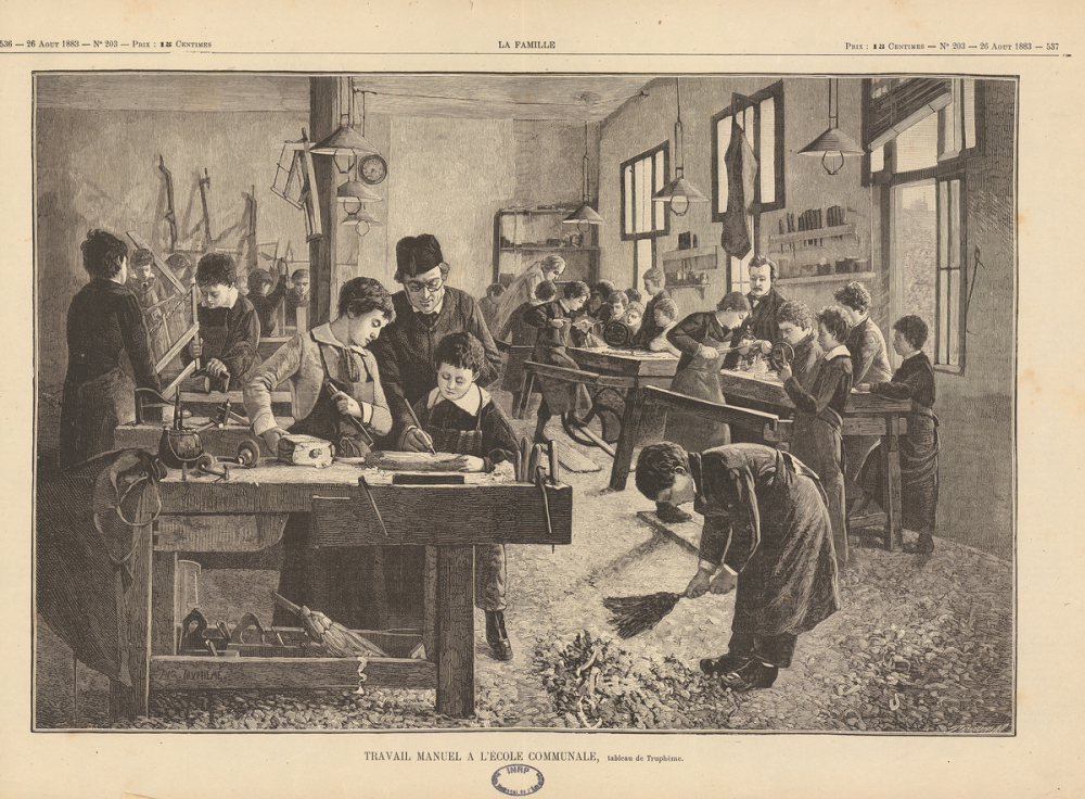 Notes : Scène scolaire dans une école primaire de garçons. Atelier de menuiserie. Les enfants, debouts autour des établis, scient, liment sous les yeux attentifs des maîtres. Un enfant, au premier-plan, balaie les copeaux de bois au sol.