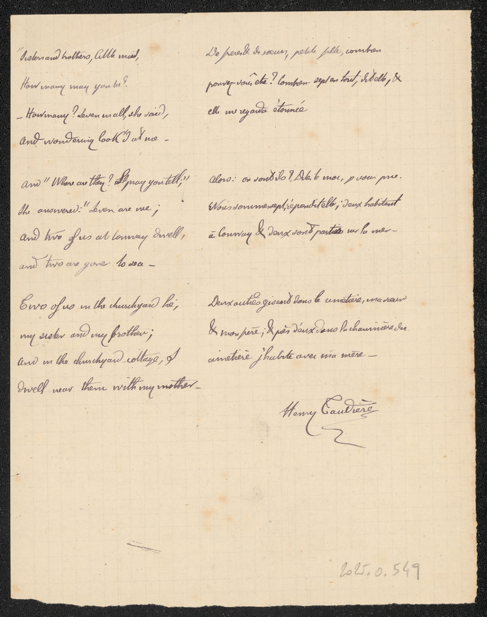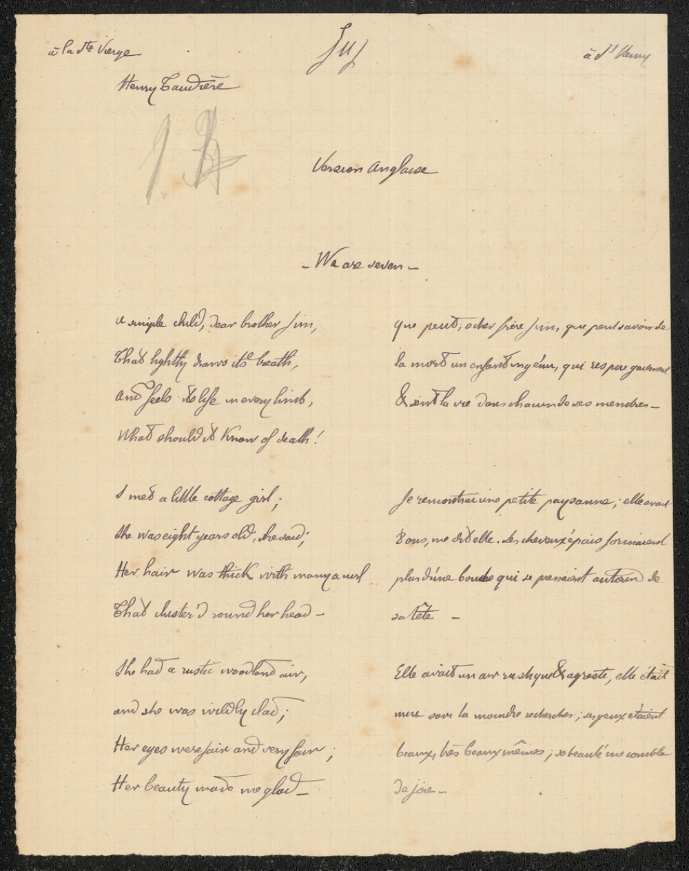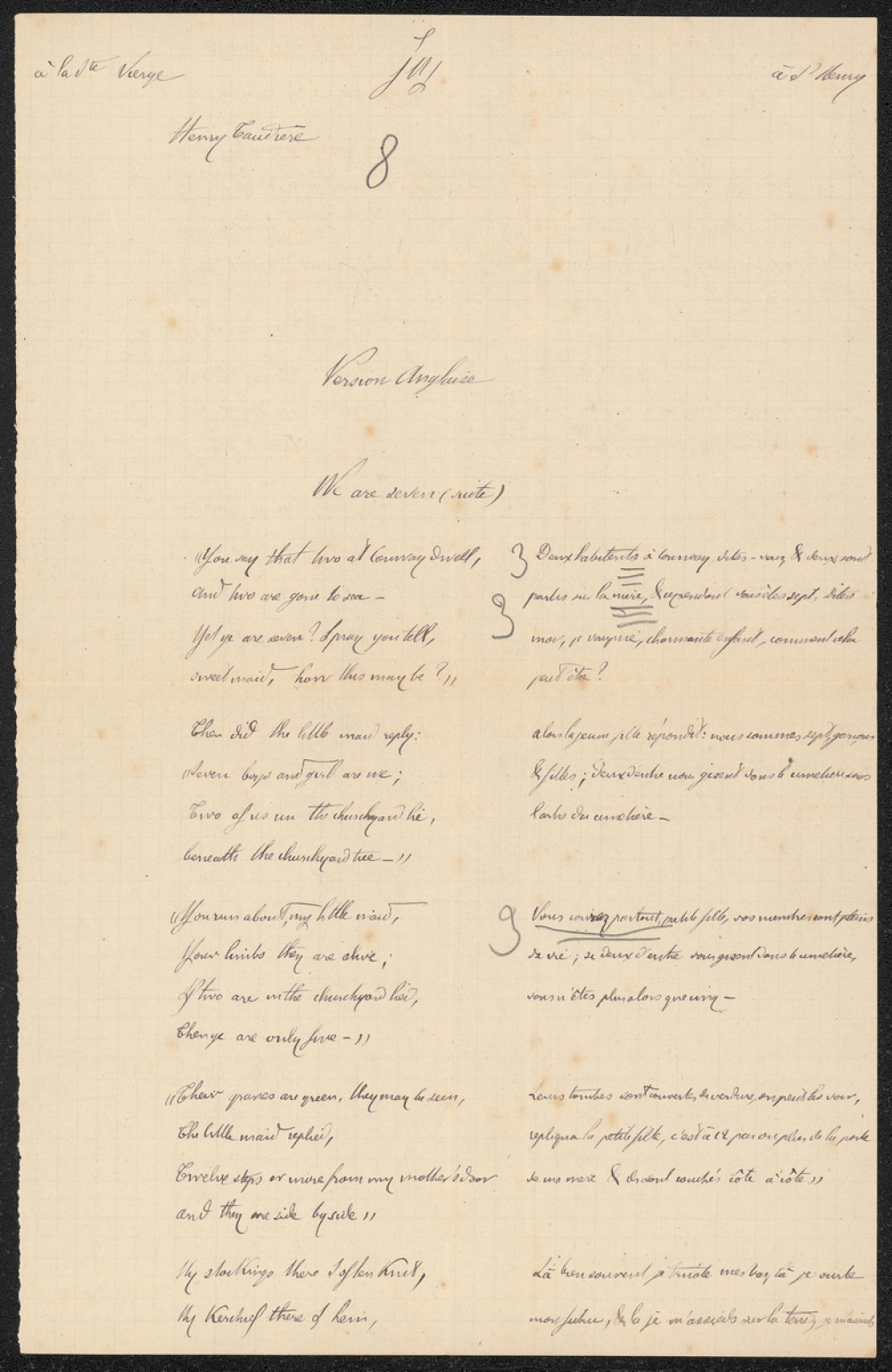 Notes : Il s'agit de deux copies de version anglaise de l'élève Henri Taudière, scolarisé au collège Saint-Joseph de Poitiers, probablement en Seconde durant l'année 1874 à 1875.