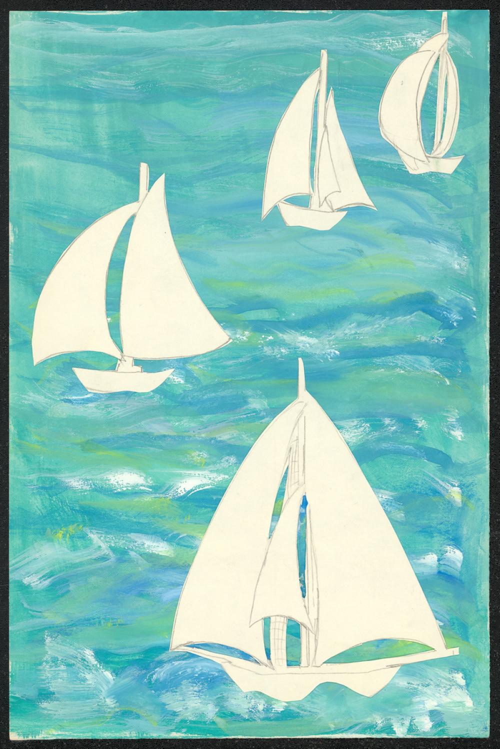 Représentations : bateau à voiles, mer / Plusieurs nuances de bleu, vert, blanc, et jaune, recouvrent la feuille, représentant la mer. Quatre voiliers blancs découpés dans du papier Canson sont collés çà et là sur la mer. Certains détails des bateaux sont dessinés au crayon à papier.