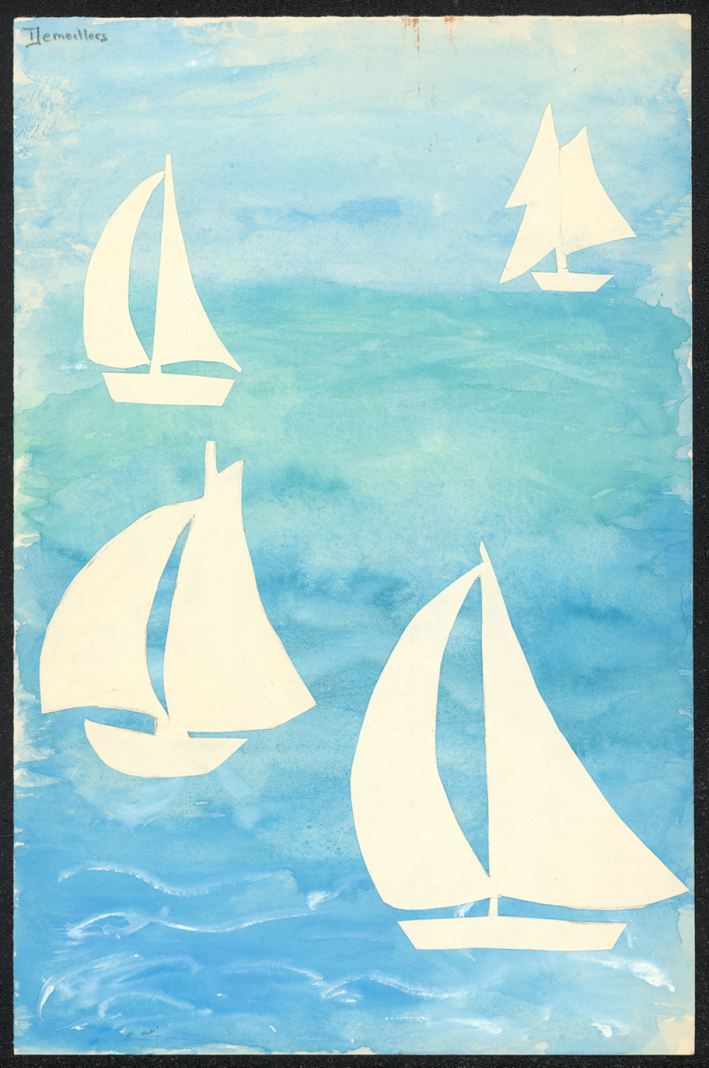 Représentations : bateau à voiles, mer / Plusieurs nuances de bleu, vert, et blanc, recouvrent la feuille, représentant la mer. Quatre voiliers blancs découpés dans du papier Canson sont collés çà et là sur la mer.