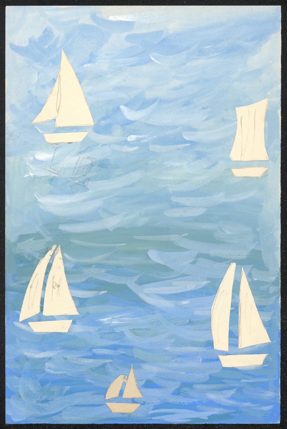 Représentations : bateau à voiles, mer / Plusieurs nuances de bleu, vert, et blanc, recouvrent la feuille, représentant la mer. Quatre voiliers blancs découpés dans du papier Canson sont collés çà et là sur la mer. Au pied de la feuille, un cinquième est réalisé à partir d'un autre type de papier, plutôt beige que blanc. Quelques détails des bateaux sont dessinés au crayon à papier. Sur la gauche de la feuille est écrit en grosses lettres au crayon à papier le terme "LE".