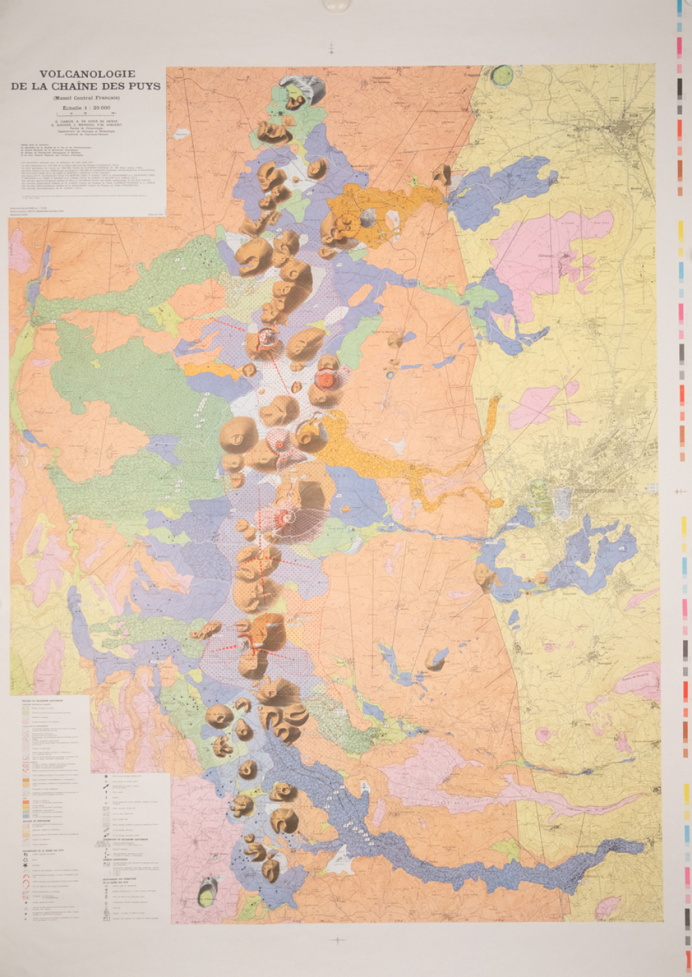 Notes : Carte en couleurs réalisée par l'Equipe Volcanologie du département de Géologie et Minéralogie à l'Université de Clermont-Ferrand. Elle représentant la chaîne des Puys à l'échelle 1 : 25 000 et est accompagnée d'une légende. La carte a été éditée avec le concours du Ministère de la Qualité de la Vie et de l'Environnement, du Centre National de Recherche Scientifique, du Bureau de Recherches Géologiques et Minières et du Parc Naturel Régional des Volcans d'Auvergne.