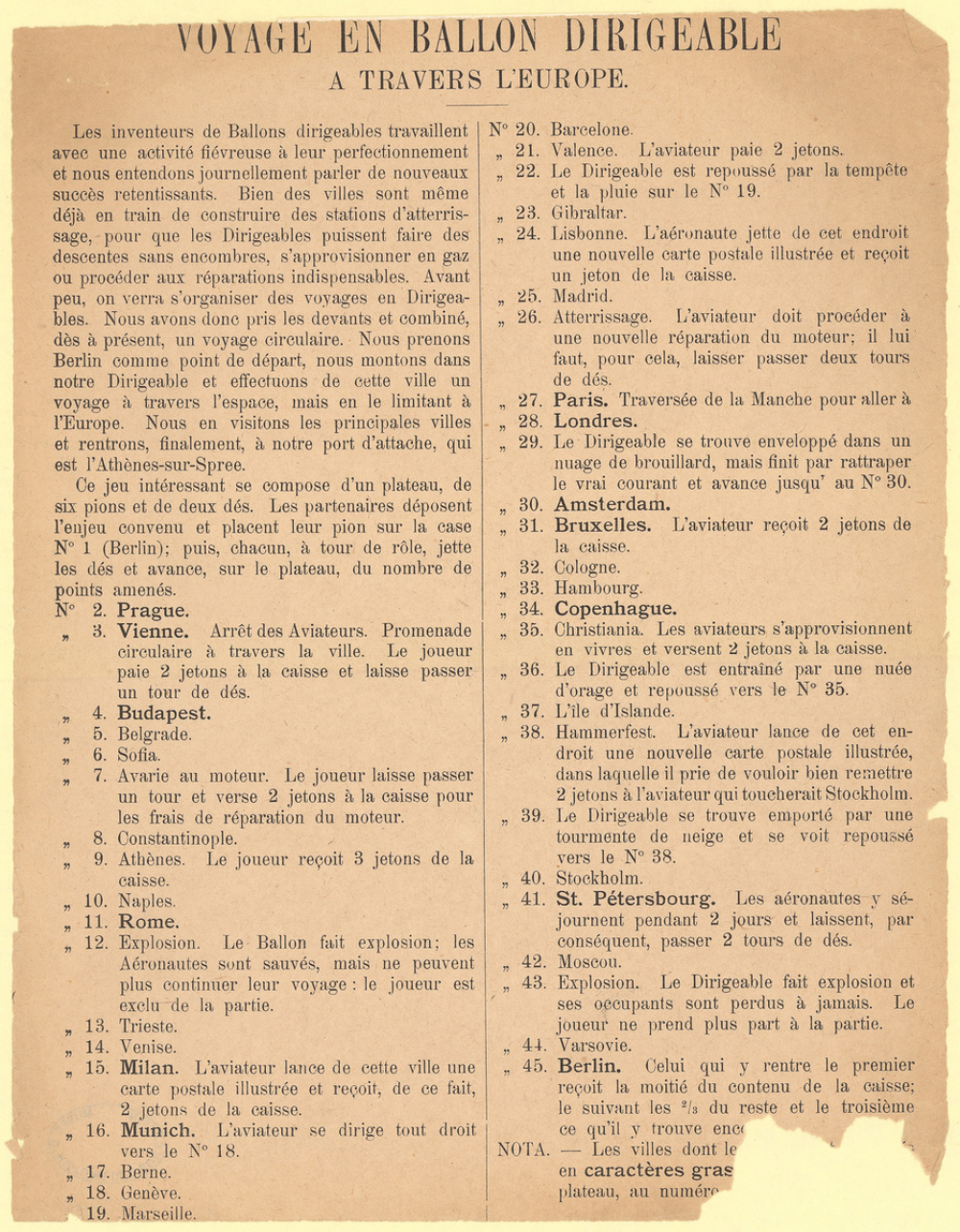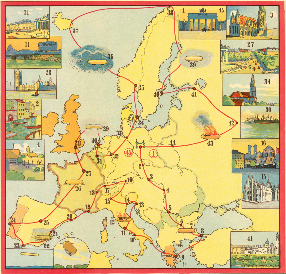 - Un plateau de jeu de type jeu de l'oie, sous forme de carte de l'Europe. Le parcours tracé fait le tour du continent, partant et revenant à Berlin, en 45 étapes. Sur les côtés, 15 vignettes illustrent certaines étapes du parcours (Berlin, Paris, Copenhague, Milan, Venise, Londres...). Plusieurs accidents sont représentés (tempêtes, explosions, incendies...), qui sont détaillés dans la règle.