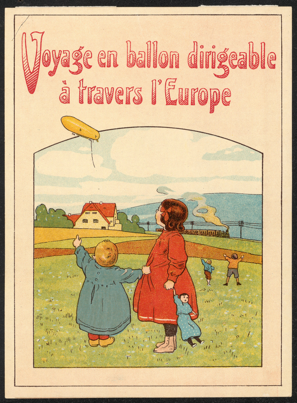 - Une couverture (?) avec le titre du jeu en haut, et une image d'illustration occupant les 2/3 de la page. On y voit au premier plan deux enfants regardant le ciel, le plus petit à gauche montrant du doigt un ballon dirigeable qui survole la scène. Au deuxième plan deux enfants regardent également vers le ciel et lèvent les bras. A l'arrière plan, quelques maisons et un train à vapeur.