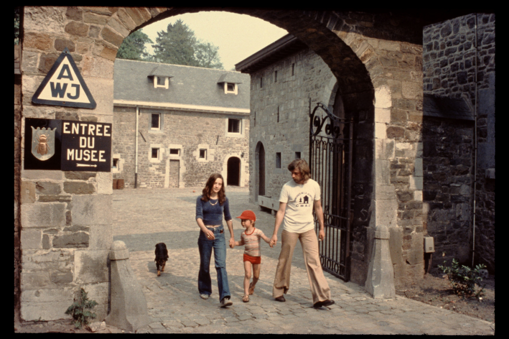 Représentations : scènes : auberge / Trois personnes sortent d'un musée. La femme et l'homme tiennent le garçon par la main. Un chien les suit. Deux panneaux sont visibles : l'un indique l'entrée du musée avec un écusson représentant une abeille, et au-dessus se trouve un panneau avec les lettres AWJ.