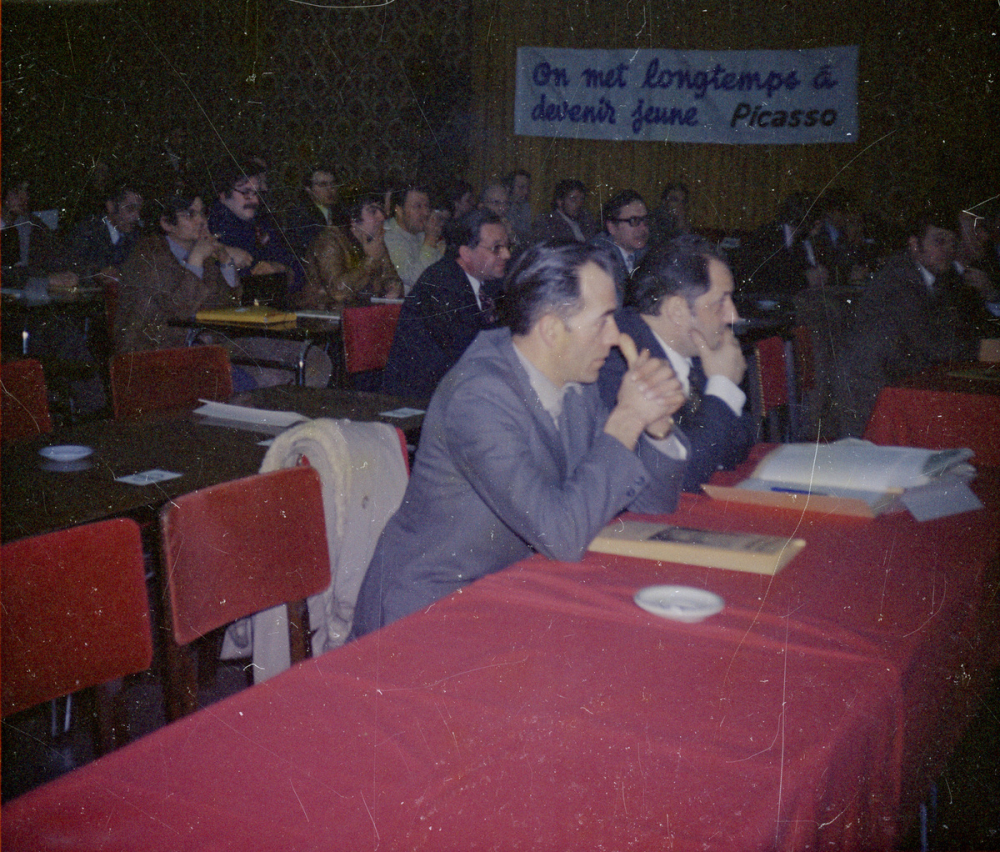 Représentations : scènes : groupe / On voit des personnes assises devant une scène sur laquelle se trouvent plusieurs intervenants et une table. Devant cette table, une banderole porte l'inscription « Fédération unie des auberges de jeunesse – 14ᵉ congrès national ».