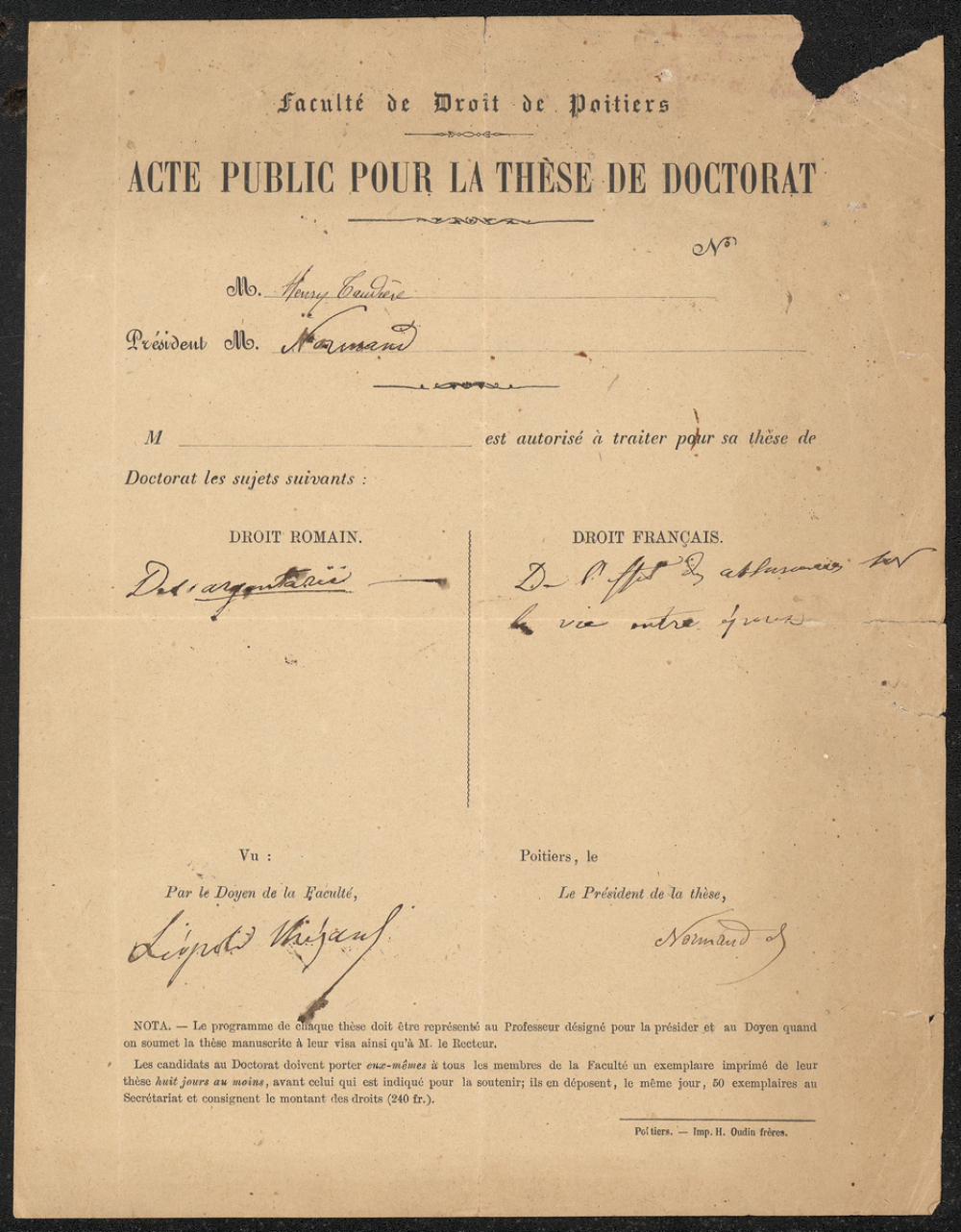 Notes : Il s'agit du dépôt de la thèse de Doctorat de Droit de l'étudiant Henry Taudière, inscrit à la Faculté de Droit de Poitiers, en 1884.