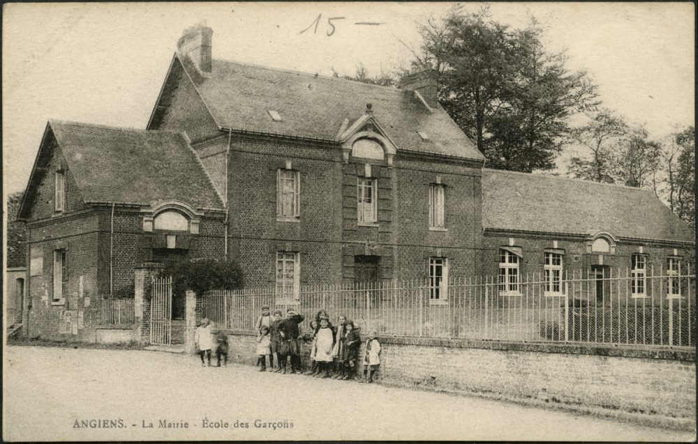 Notes : Photographie représentant la façade de l'école des garçons; quelques enfants adossés à la grille regardent vers l'objectif.