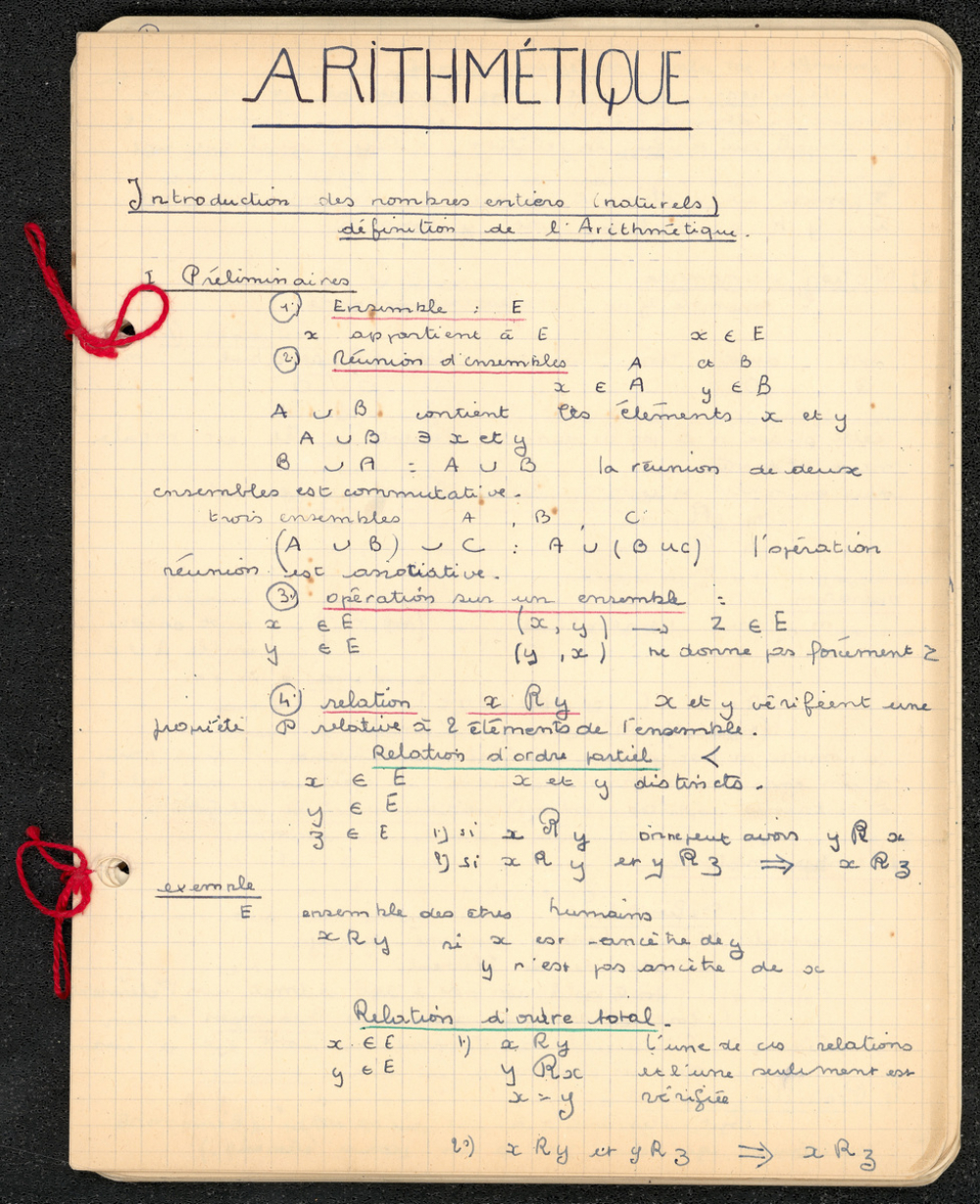 Notes : Il s'agit du cahier d'arithmétique de Marie-France Rocquemont (épouse Morel), élève alors scolarisée au lycée Marie Curie de Sceaux (Hauts de Seine, ex-Seine) en classe de Terminale série Mathématiques élémentaires, durant l'année 1958-1959.