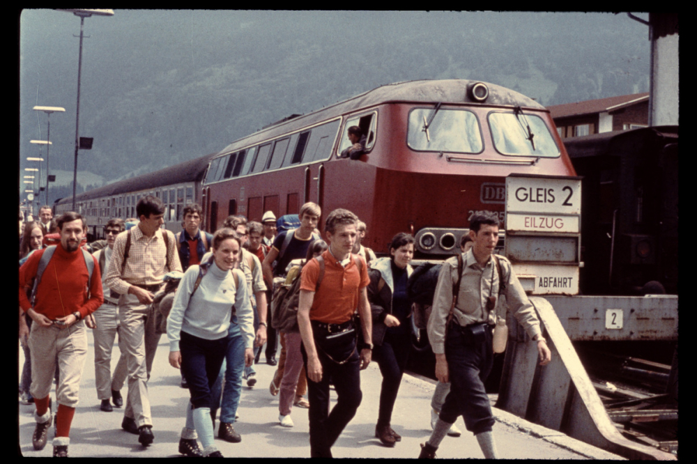 Représentations : scènes : train / Un train rouge est à quai, avec le conducteur la tête sortie par la fenêtre. Des voyageurs portant des sacs à dos se tiennent sur le quai.