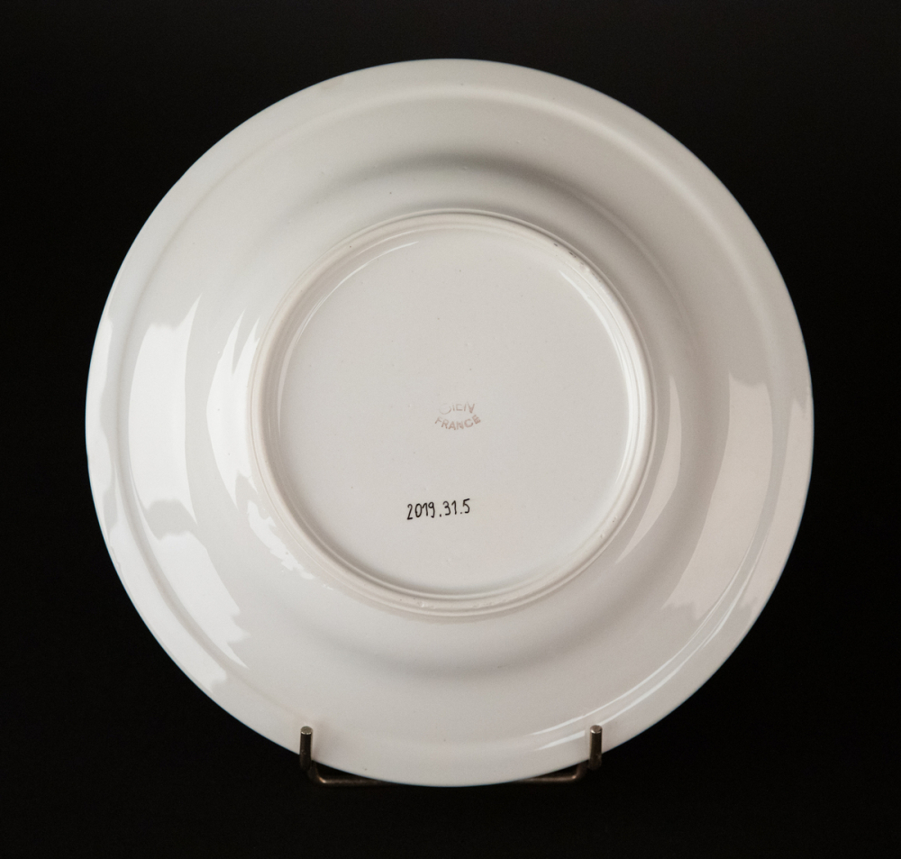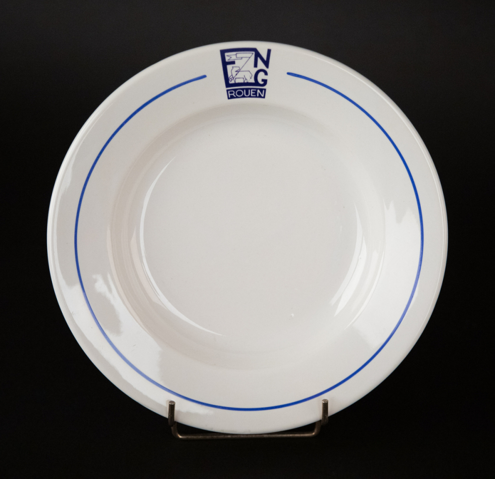 Description : Assiette creuse blanche avec liseré bleu, avec sur l'aile, interrompant le liseré, le blason de Rouen au trait (le mouton portant étendard) encadré par les lettres E, N, G en bleu. Au revers, estampille noire "Gien France".