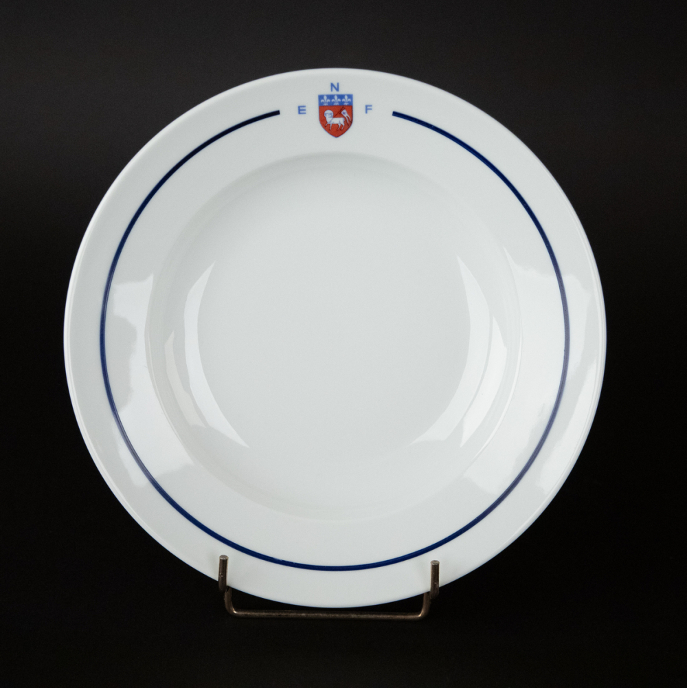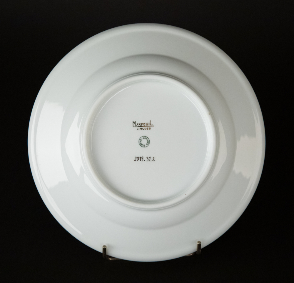 Description : Assiette creuse blanche avec liseré bleu, avec sur l'aile, interrompant le liseré, le blason de Rouen encadré par les lettres E, N, F en bleu. Au revers, estampille noire "Marfeuil Limoges" et estampillage rond vert "Limoges France".