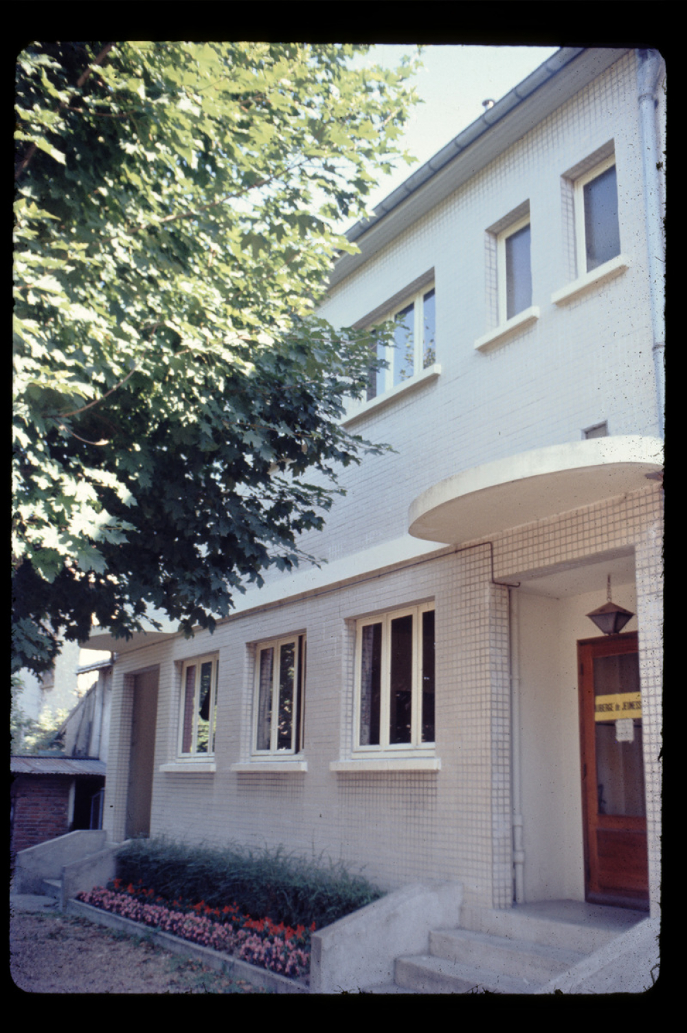 Représentations : vue d'architecture : auberge / Une partie de la façade de l'auberge est visible, avec la porte d'entrée sur laquelle est fixé un panneau jaune portant l'inscription « auberge de jeunesse ». Le long de la façade se trouvent des parterres de fleurs rouges et roses.