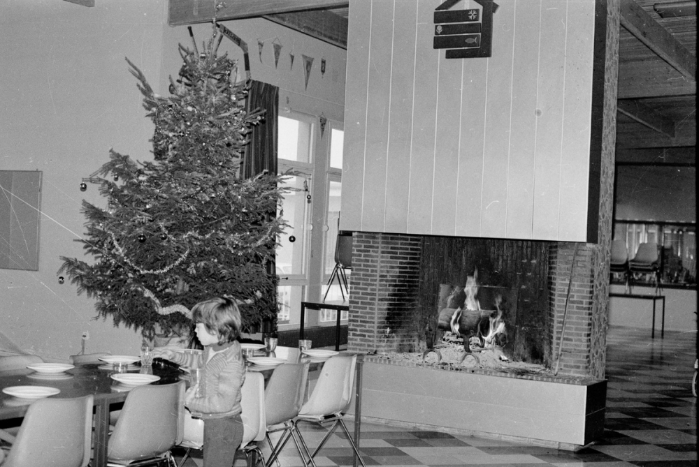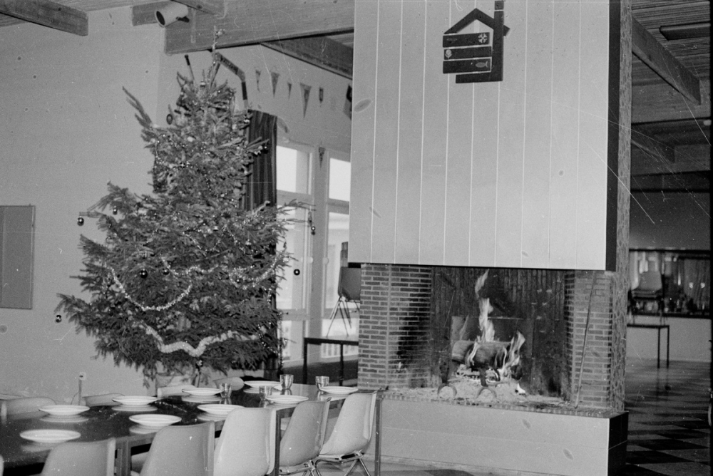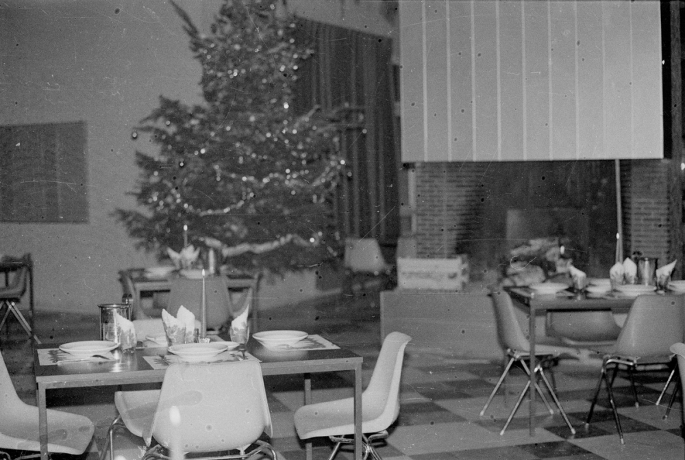 Représentations : vue d'intérieur : auberge / Différentes vues montrent la salle à manger de l'auberge, où un sapin de Noël est installé près de la cheminée. Sur l'un des négatifs, un enfant est visible.