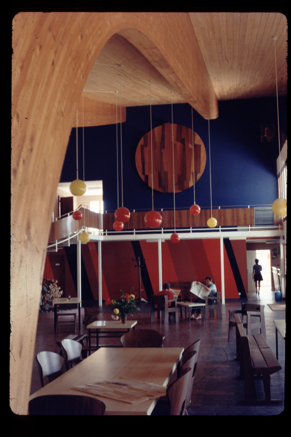 Représentations : vue d'intérieur : auberge / L'espace commun est visible, avec des personnes assises en train de lire un journal. En arrière-plan, un mur rouge et noir est visible, surmonté d'un mur bleu. Des luminaires suspendus, jaunes et rouges, éclairent la pièce.
