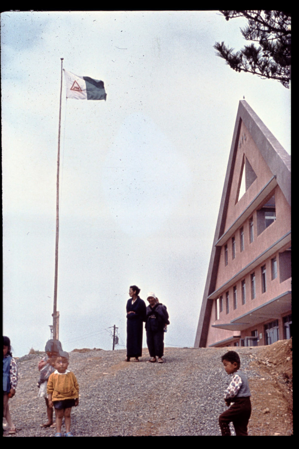 Représentations : vue d'architecture : auberge / Une partie de la façade de l'auberge est visible. Le bâtiment présente une forme en A. Un drapeau portant les lettres JYH est hissé à proximité. Deux femmes et plusieurs enfants apparaissent au premier plan.
