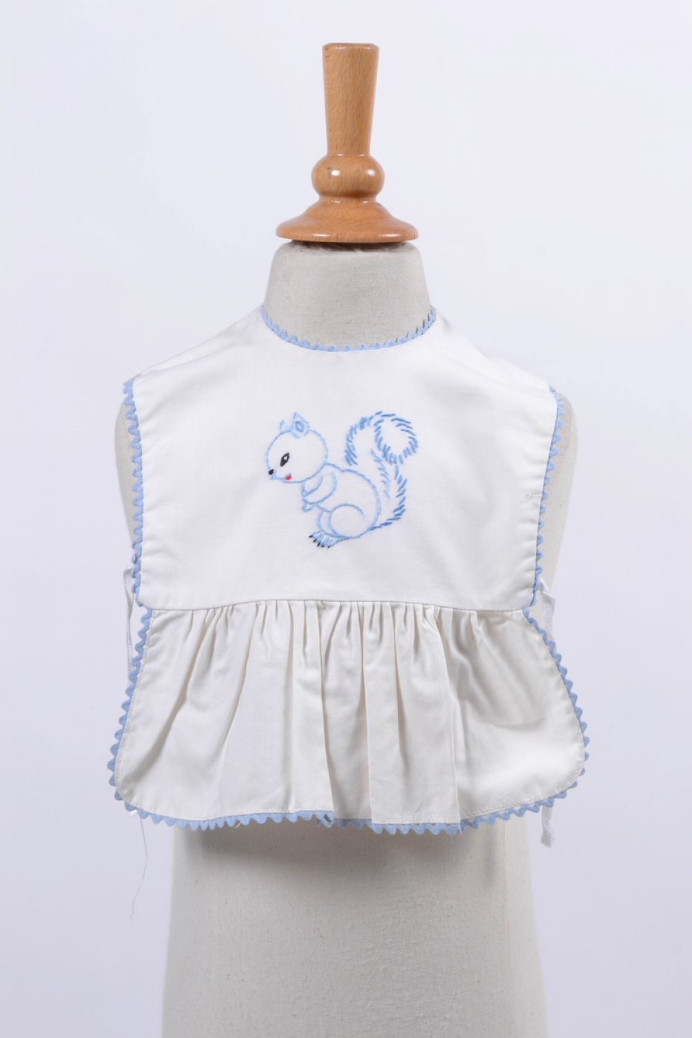 Description : Bavoir-tablier en popeline de coton blanc, encolure ras-du-cou, panneau central orné d'un écureuil brodé à la laine bleue et noire et prolongé en son bas d'un empiècement monté à plis formant volant.