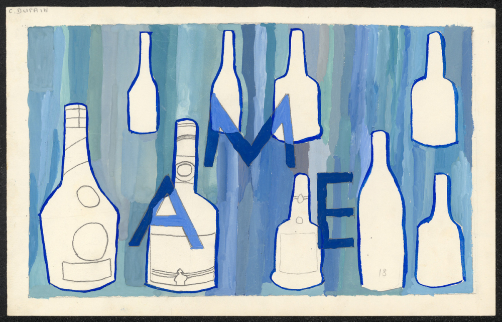 Représentations : bouteille / La feuille est peinte par des coups de pinceau de différentes nuances de bleu, vert, et gris, dans un cadre tracé au crayon à papier et prenant quasiment toute la surface de la feuille. Neuf bouteilles (sans doute de vin ou de liqueur) sont représentées par des espaces laissés blancs au milieu du cadre et entourés par des traits de peinture bleue marine. Trois d'entre elles sont complétées par des dessins au crayon à papier représentant les motifs de la bouteille. Les lettres AME sont écrites en gros au milieu de la feuille. Elles sont délimitées au crayon à papier et peintes en bleu marine ou en bleu selon si elles couvrent de la peinture ou une bouteille.