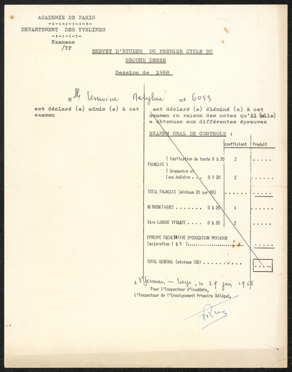 Notes : Il s'agit de l'attestation de Brevet d'Etudes du premier cycle du second degré de l'élève Maryline Lemoine, scolarisée à l'école des filles de Sartrouville (Jules Ferry) lors de la session de 1968.