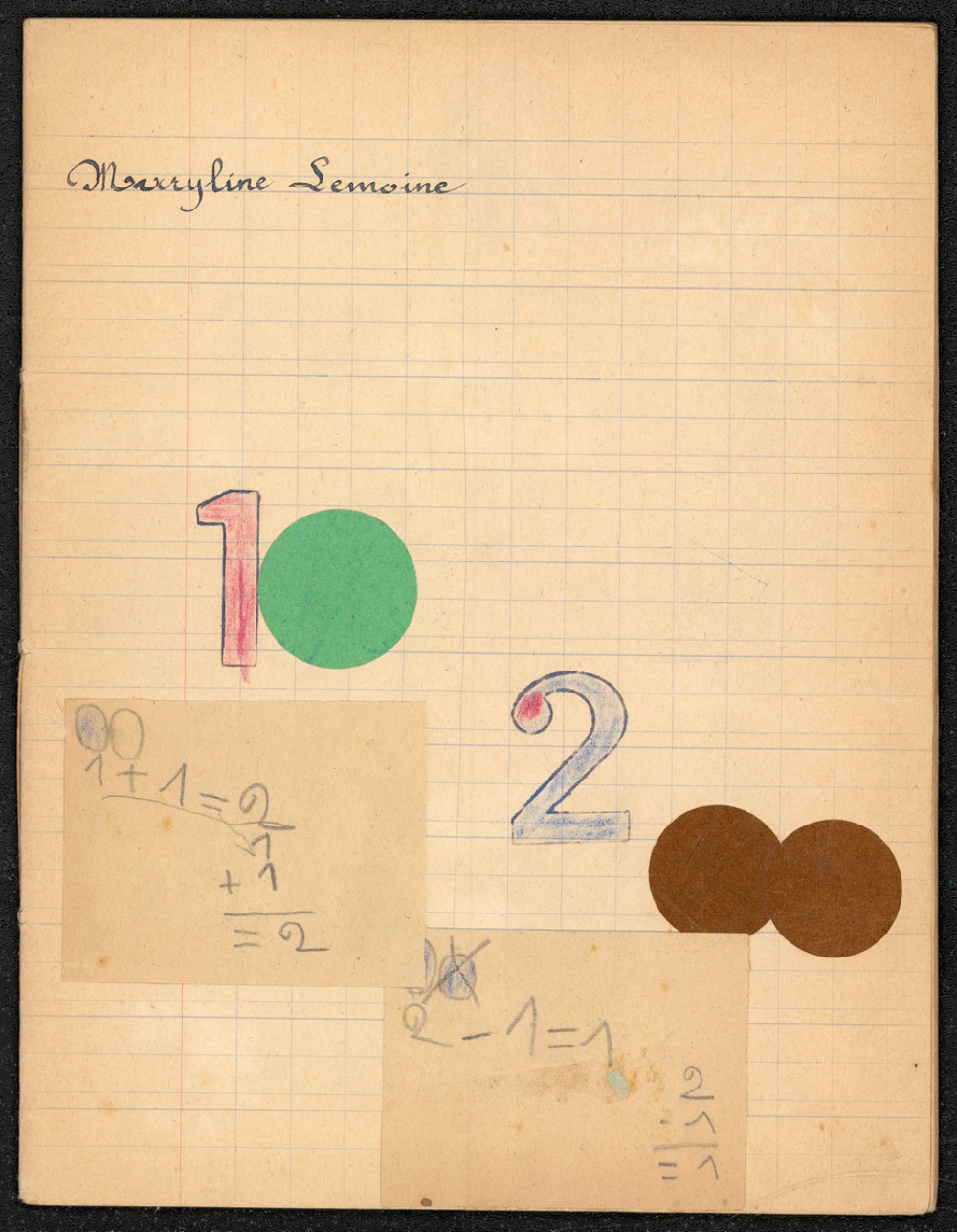 Notes : Il s'agit du cahier de calcul de l'élève Maryline Lemoine, probablement scolarisée en classe de maternelle dans une école de Sartrouville, durant l'année scolaire 1957-1958.
