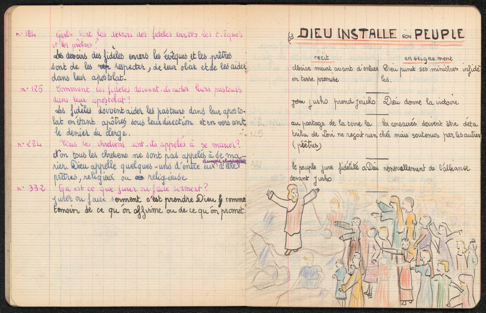 Notes : Il s'agit du cahier de catéchisme de Marie-France Rocquemont (épouse Morel), élève alors scolarisée au lycée Marie Curie de Sceaux (Hauts de Seine, ex-Seine) en classe de 5e 3, durant l'année 1953-1954.