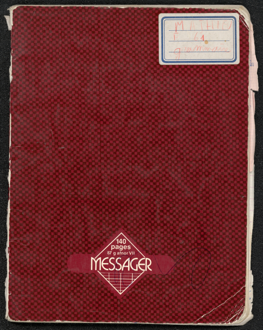Description : Cahier en papier vélin de marque "Messager", à la couverture en papier pelliculé et à la reliure piquée agrafée. Réglure Séyès.