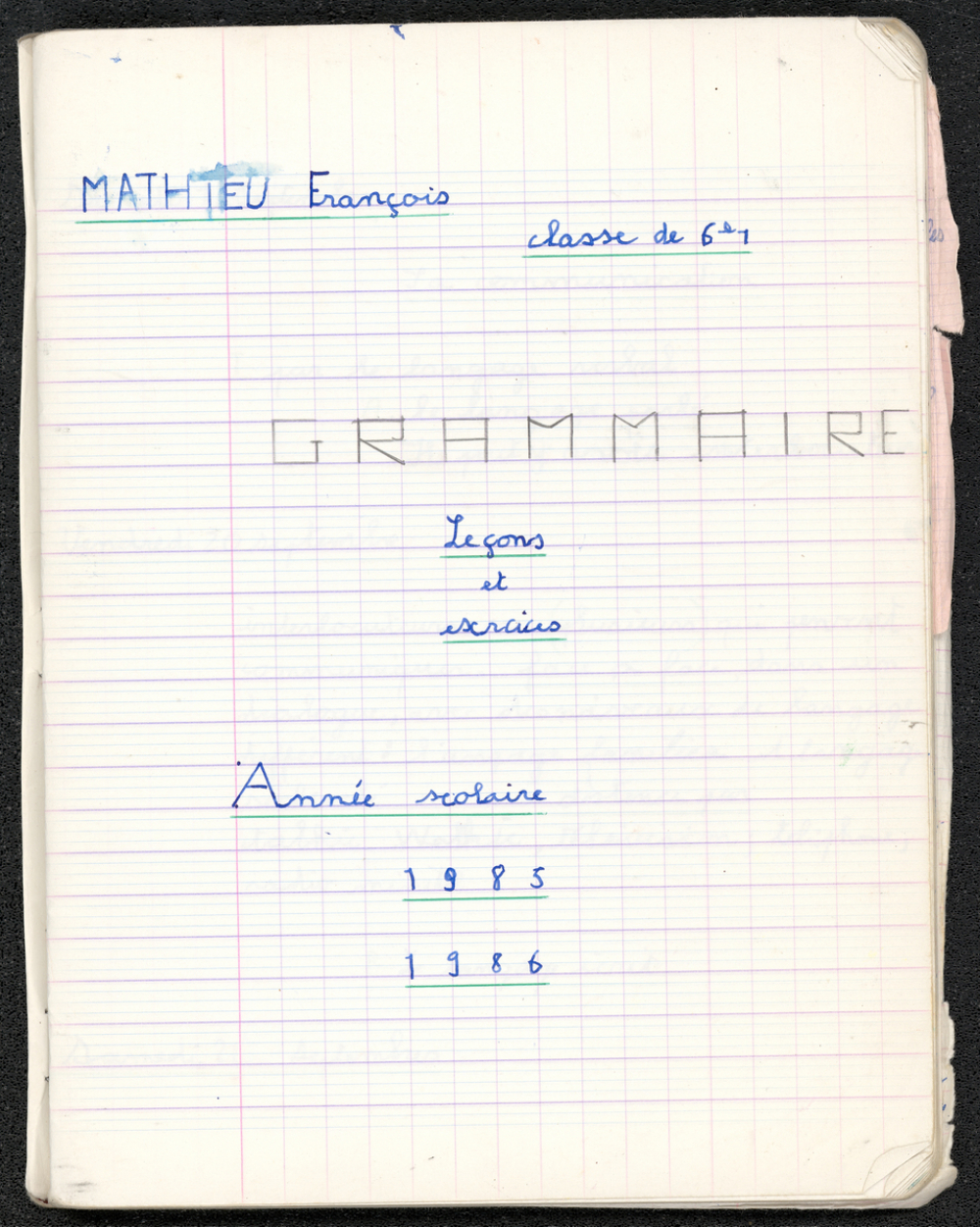 Notes : Cahier de grammaire appartenant à François Mathieu, scolarisé en classe de 6ème pour l'année scolaire 1985-1986.