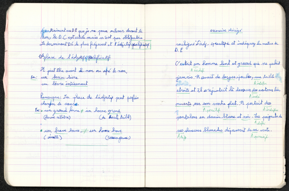L'ensemble est écrit à l'encre bleue, avec des mentions à l'encre rouge ou verte (pour les annotations et le soulignement), et l'utilisation ponctuelle du crayon à papier.