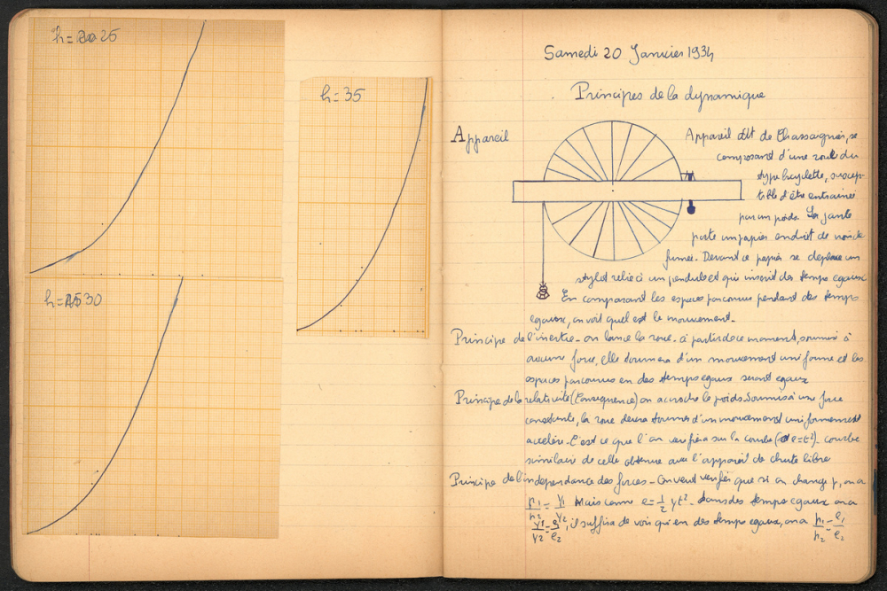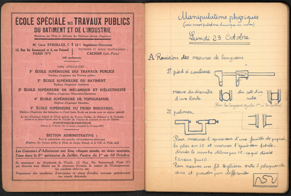Notes : Il s'agit du cahier de manipulations de Science-Physique et de Chimie d'Yves Rocquemont, élève scolarisé au Lycée Pasteur de Neuilly-sur-Seine en classe de Mathématiques élémentaires (Terminale), durant l'année 1933-1934.