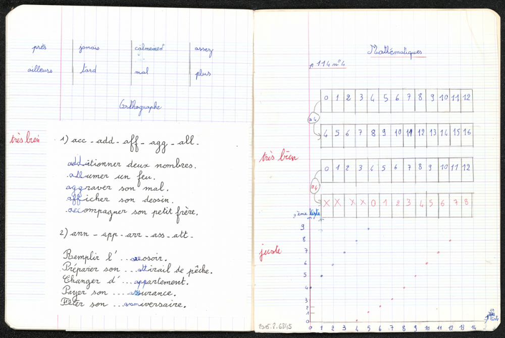 Les appréciations de l'enseignante sont écrites marginalement à l'encre rouge.