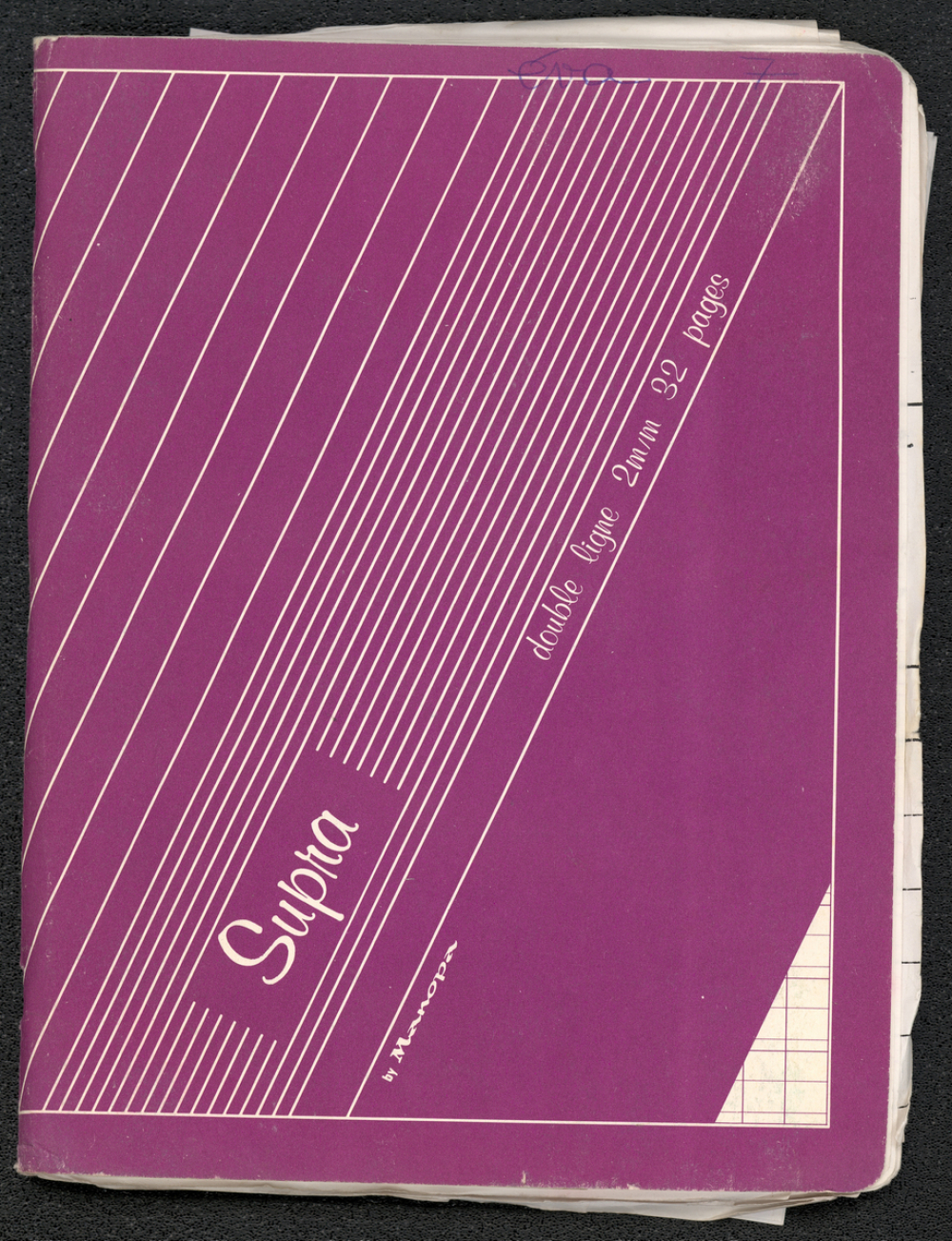 De nombreuses feuilles polycopiées de dimensions diverses sont insérées et collées sur des pages du cahier.