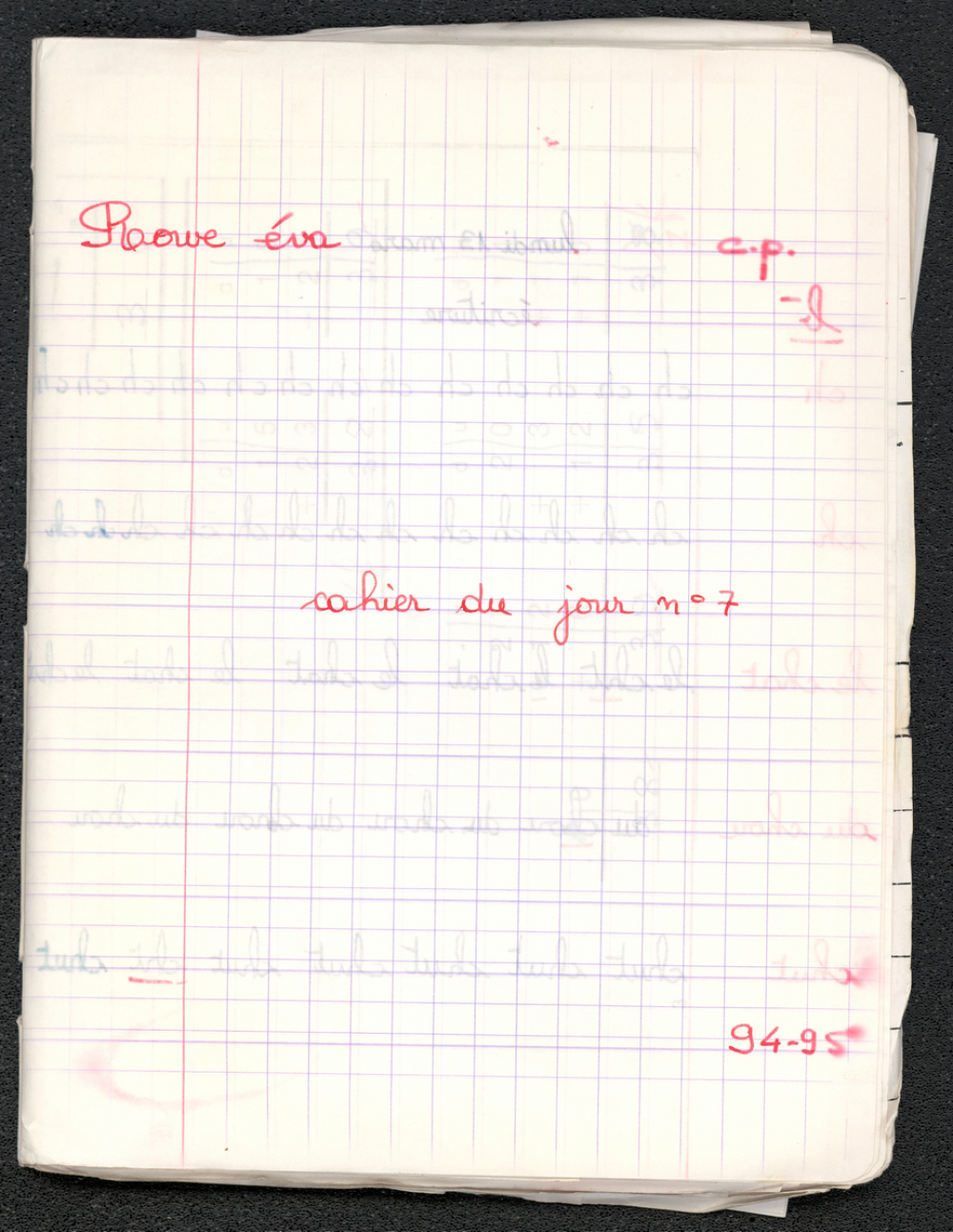 Notes : Cahier du jour n°7 appartenant à Eva Rouve, scolarisée en classe de CP pour l'année scolaire 1994-1995.