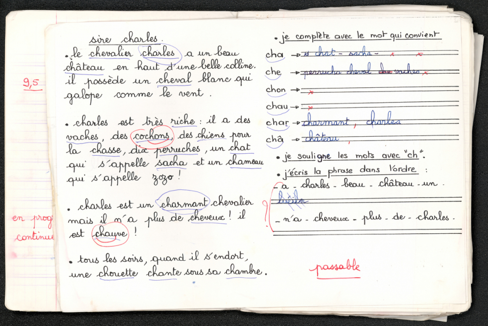 L'ensemble consiste en des travaux et des exercices d'écriture (traçage des lettres, dictée de mots) et de mathématiques.