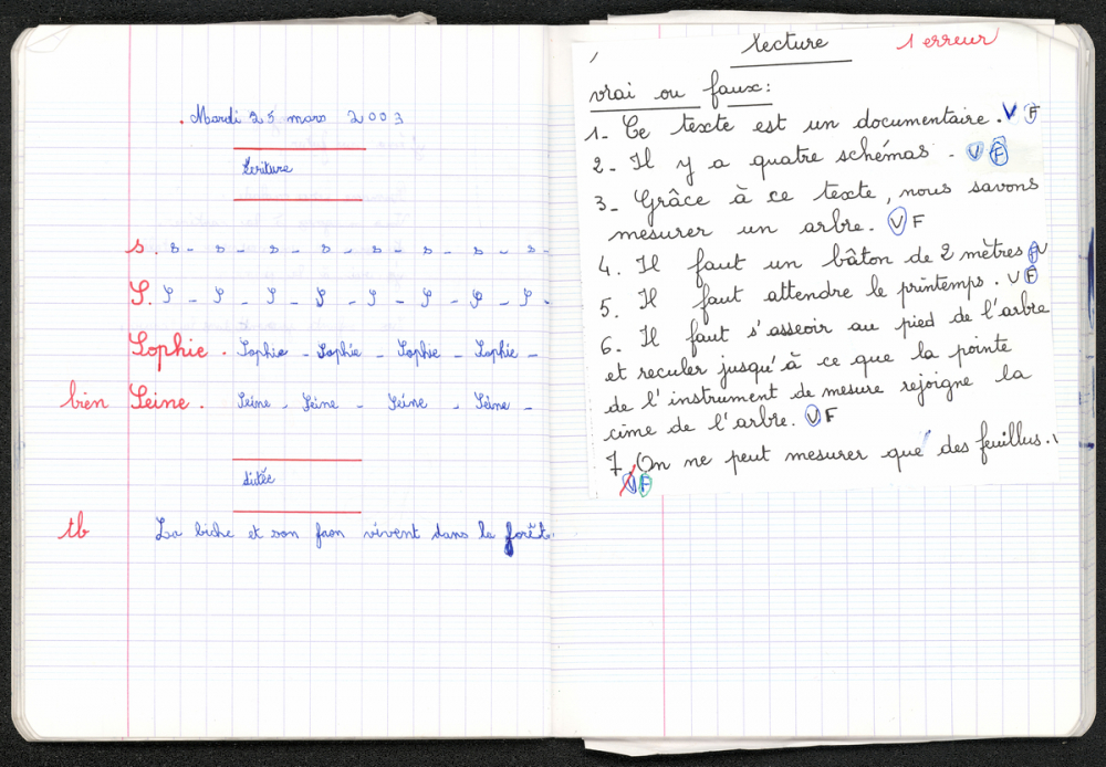 Les appréciations de l'enseignante sont écrites marginalement à l'encre rouge. De nombreuses feuilles polycopiées imprimées à l'encre noire sont insérées dans le cahier. Quelques illustrations sont coloriées au feutre multicolore.